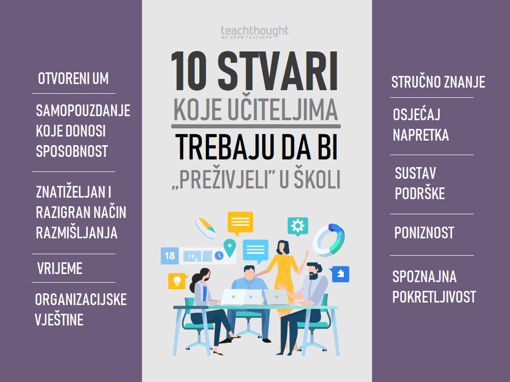 Međutim, katkad upravo ona manje vidljiva svojstva mogu odrediti dugoročni uspjeh učitelja. U tekstu možete pronaći deset stvari koje svakom učitelju odnosno učiteljici trebaju da bi „preživjeli” u učionici. Neke od njih su apstraktne, poput načina razmišljanja, dok se druge mogu ubrojiti pod vještine, poput organizacije i upravljanja vremenom. Uglavnom, radi se o nizu faktora koji mogu pridonijeti učiteljskom uspjehu.