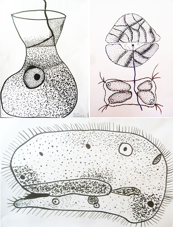 Suradnja s kolegicom Dunjom bila je sjajna i novo veliko iskustvo. U odabranim područjima biologije učenici petih razreda tušem i flomasterima prikazali su praživotinje (skupinu jednostaničnih organizama), učenici šestih razreda optičkim su miješanjem boja prikazali alge kremenjašice, đaci sedmih razreda tonskom su modelacijom prikazali kromosome, a oni iz osmih razreda vješto su portretirali znanstvenike biologe.