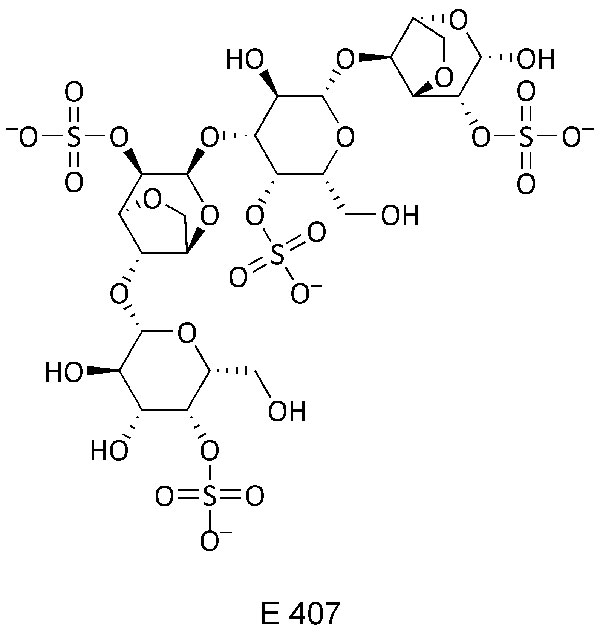 Karagenan (E407) služi kao zgušnjivač. Po svojoj kemijskoj strukturi karagenan je linearni sulfatirani polisaharid koji se ekstrahira iz crvenih morskih algi. Neprobavljiva je tvar koja pospješuje probavu, a iz organizma se izlučuje u nepromijenjenu obliku. Velike doze djeluju laksativno i mogu omesti resorpciju nekih mineralnih tvari (npr. kalija). U rijetkim slučajevima može uzrokovati alergiju.