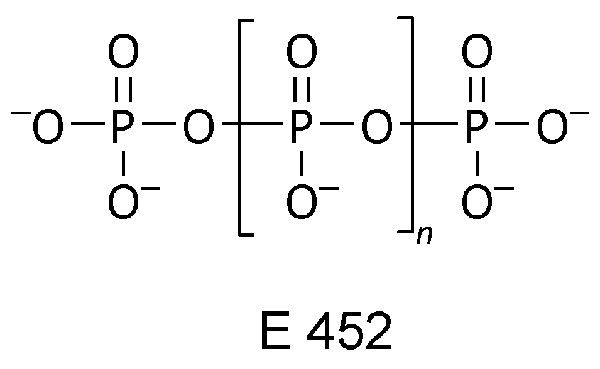 Slijede tripolifosfati, Na5P3O10 ili K5P3O10 (E451) i polifosfati (E452) koji imaju uloge regulatora kiselosti i stabilizatora. Fosfati u velikim koncentracijama mogu ometati resorpciju kalcija, magnezija i željeza u organizmu, pa redoviti unos većih količina (više od 1,5 do 2,5 g na dan) može uzrokovati smanjenje koštane mase, osteoporozu i taloženje kalcija u organizmu.