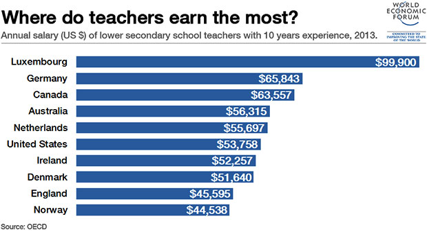 Na OECD-ovu grafičkom prikazu iz 2013. naslovljenom „Gdje učitelji najviše zarađuju?“ koji se odnosi na godišnju zaradu nastavnika s desetogodišnjim iskustvom u nižim razredima srednje škole predstavljeni su sedam europskih zemalja te SAD, Kanada i Australija. Najviša godišnja nastavnička plaća dijeli se u Luksemburgu – 99.900 američkih dolara (687.312 kuna, mjesečno 57.276 kuna) dok je najniža u Norveškoj, s više nego upola nižim iznosom – 44.538 dolara (306.421 kuna, mjesečno 25.535 kuna).