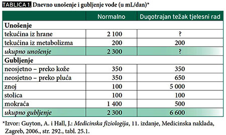 Svakodnevnim unosom tekućine mora se nadoknaditi sva voda koja se iz organizma izluči raznim fiziološkim putovima. Dnevni unos vode jako se razlikuje od osobe do osobe, a ponajprije ovisi o tjelesnoj aktivnosti i klimatskim uvjetima.