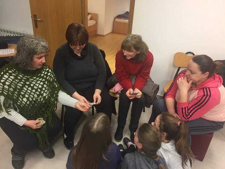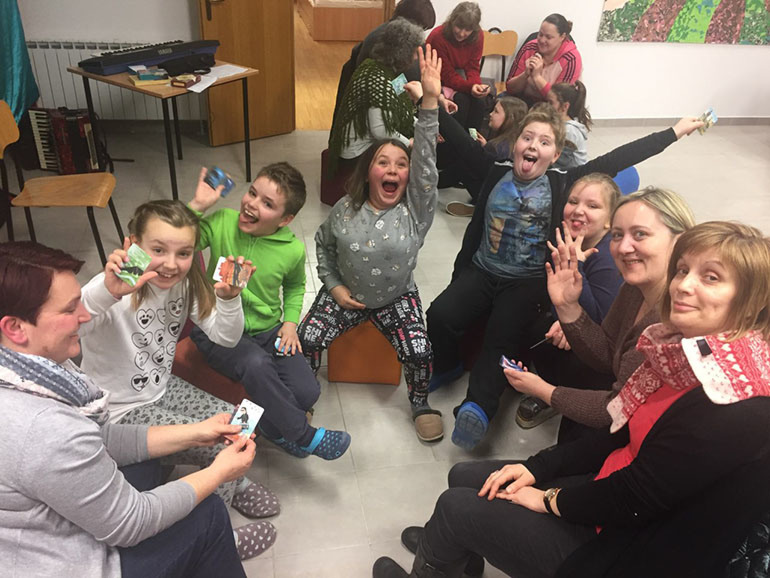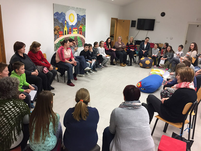 Posljednja, grupna aktivnost roditelja i djece prije zajedničke večere bila je osmišljavanje zajedničke priče po motivacijskim karticama.