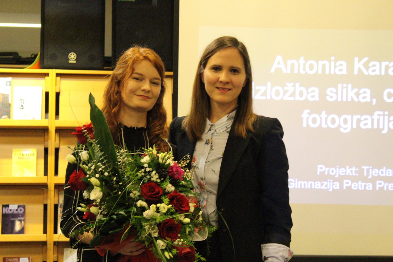 Učenica Antonia Karačić ovom se prigodom svojom prvom samostalnom izložbom predstavila s tri likovno-vizualne tehnike: ulje na platnu, tuš i kist i fotografija. Radovi su nastali od 2014. do 2018. godine, od autoričine petnaeste do osamnaeste godine, a karakteriziraju ih ne samo izniman talent, već i izvrsno tehničko znanje i zrelost koja nadilazi autoričinu dob. Antonia se predstavila s dvadeset radova koje je na izložbi povezala s književnim djelima domaćih i stranih književnika. [ Izvor: Facebook ]