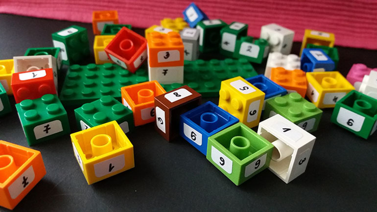 Uzela sam pedesetak kockica različitih boja, ali istog oblika (s četiri kapice, u obliku kvadrata). Sa svake strane sam nalijepila naljepnicu na koju sam napisala brojke od 1 do 9. Dakle, jedna kockica, četiri naljepnice, četiri brojke – po jedna sa svake strane. Dobila sam i jednu pločicu za građenje na koju će učenici slagati kockice u igri.