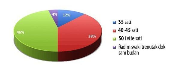 Više od polovice sudionika u istraživanju radi toliko sati tjedno da to radno vrijeme nazivaju „neodrživim”. Vrlo ih je malo izjavilo da je njihovo radno vrijeme blizu „normalnome broju radnih sati” (12 posto).
