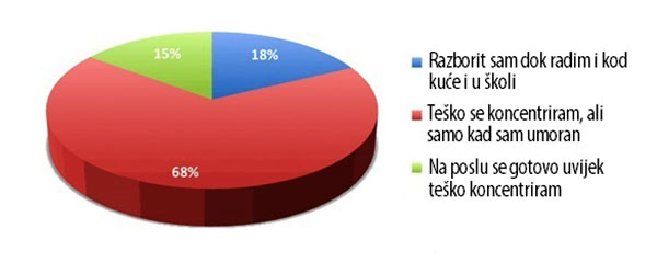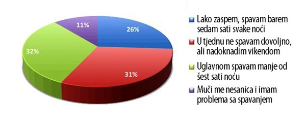 Čak 43 posto učitelja koji su sudjelovali u anketi spavaju manje od šest sat. Ne znamo koliko su njihove poteškoće sa spavanjem povezane s poslom, ali mnogi se učitelji žale na probleme sa spavanjem zbog stresa u školi.