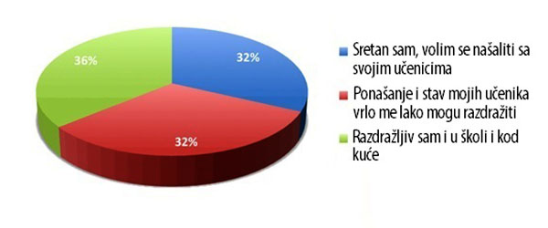 Ovo je pitanje važno, jer je razdražljivost rano upozorenje da se osoba teško nosi sa stresom. Srećom, 32 posto učitelja koji su sudjelovali u anketi sretno je i ne osjećaju stres na radnome mjestu. To je pozitivan dokaz da postoje škole gdje osoblje ima zdravu ravnotežu između rada i uživanja u poslu. Međutim, za 68 posto učitelja situacija nije takva, što dovodi do zaključka da je stres na poslu problem za mnoge učitelje.