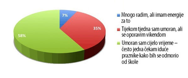 Kad analizirate odgovore na ovo pitanje i tome dodate radno vrijeme mnogih učitelja, rezultati su zabrinjavajući. Čak 58 posto učitelja kaže da su stalno umorni i čekaju prve sljedeće praznike da se odmore. Iako je ovaj rezultat subjektivan, školski praznici postoje s razlogom. Mnogi se učitelji oslanjaju na njih kako bi se lakše nosili s iscrpljujućom prirodom posla.