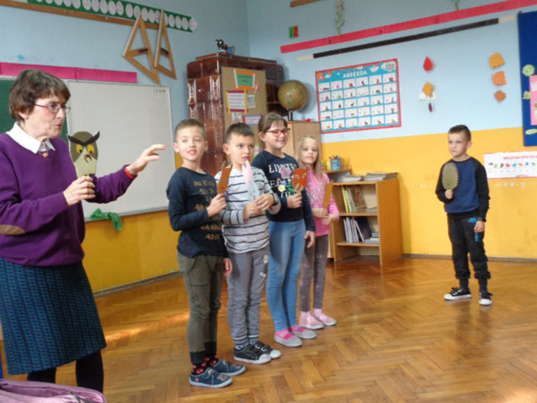 Književnica je najprije posjetila PO Slatina. Vesela, vedra i nasmijana gošća puni je sat vremena zaokupljala pažnju učenika poučnim pričama. Iz svoje vjerne suputnice, Ljubice Torbić (ljubičaste torbe), književnica je izvlačila rekvizite i neobične predmete. Učenici su tako čuli priče iz šumske škole, prepoznavali glazbene instrumente, glumili i smijali se s gošćom.