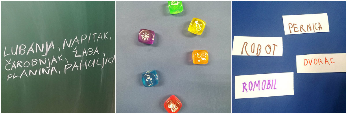 - Svaki dan jedan učenik baci kockice, drugi zapiše opis slika na ploču i krećemo u svijet mašte.