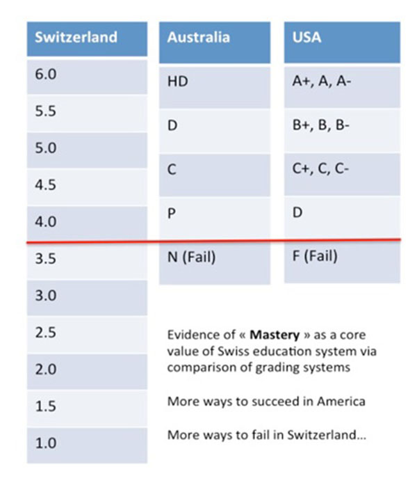 Što se tiče naglaska na svladavanju gradiva, usporedite ljestvice za svladavanje gradiva koje se promjenjuju u različitim zemljama. Švicarski sustav [poput francuskoga] ima ljestvicu ocjena na kojoj čak polovica tih ocjena nije dovoljna za prolaz. Australski i američki sustav imaju samo jednu ocjenu koja označava nedovoljan rezultat.