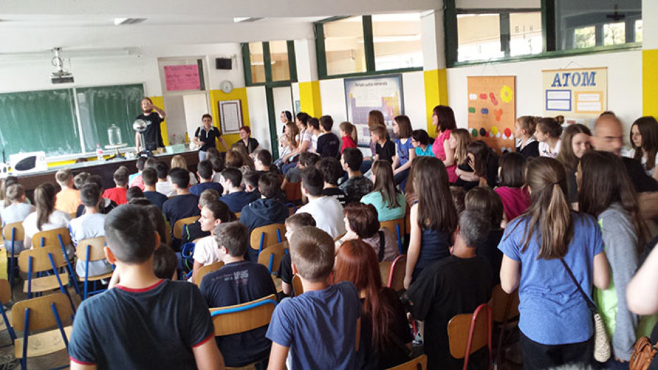Učionica fizike prepuna znatiželjnih lica, a studenti PMF-a s projektom „ FIZIKA EKSPRES“ čarobiraju tekućim dušikom. Pljesak i ushićenje odjekivali su školom.