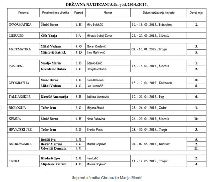 Dva prva, četiri druga, dva treća mjesta te jedno četvrto, dva peta, šesta i deseta mjesta kao i jedno 11 rezultat su nastupa učenika slavonskobrodske Gimnazije "Matija Mesić" na državnim natjecanjima održanim ove godine.