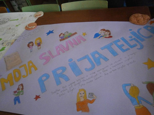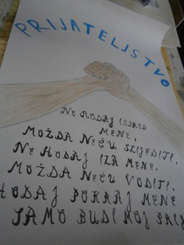 David Stojaković, 7.r. | Snažna likovna poruka prijateljstva, ali format plakata nije dovoljno iskorišten. | Vrlo dobra forma prepričavanja poglavlja u strip sličicama, ali nejasno na što se odnosi, nema naslova knjige. Blijeda usmena prezentacija.