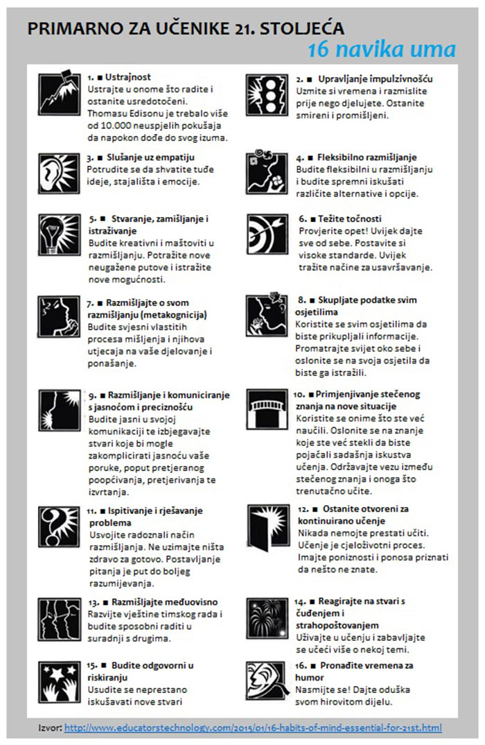 Šesnaest je navika uma koje učenici trebaju razviti radi postizanja optimalnog iskustva učenja. Riječ je o kognitivnim procesima koji funkcioniraju na analitičkoj razini da bi poboljšali mentalne i ...