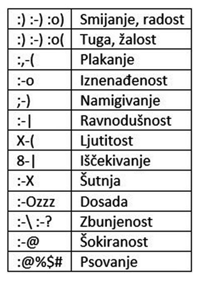 Virtualna-online komunikacija skriva nas iza medija putem kojeg komuniciramo. A opet kako bi uklonili nedostatak neverbalnih znakova i emocija rješenje je ponuđeno u obliku emotikona „tzv. hijeroglifa 21. stoljeća“-nizova spojenih znakova. Najčešće korišten emotikon je smješko (Smiley), čija se osnovna konstrukcija sastoji od oznaka za oči, nos i usta, dakle :-). Ako se ovaj niz od tri znaka pogleda okrenuto za 90°, vidi se nasmijano lice. Razumijevanje internetskog i mobilnog rječnika danas je, naročito za nas nastavnike, nužna potreba dok su emotikoni i njihova pravilna uporaba, postali pravi društveni fenomen koji je neizostavni dio moderne komunikacije.