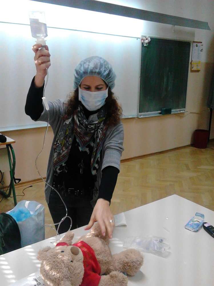 Kao model poslužio joj je malen, brz i nestašan medvjedić koji nije poštovao kućni red škole. Trčao je, penjao se i pao… Iz nosa mu je potekla krv. Što učiniti? Kako zaustaviti krvarenje? Učenici su to naučili aktivno sudjelujući u poučnom nastavnom satu.