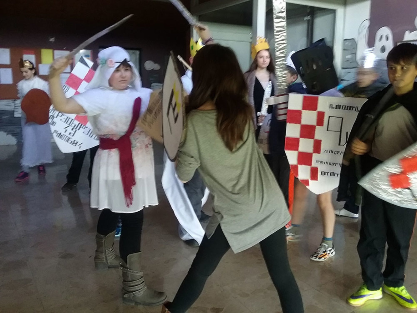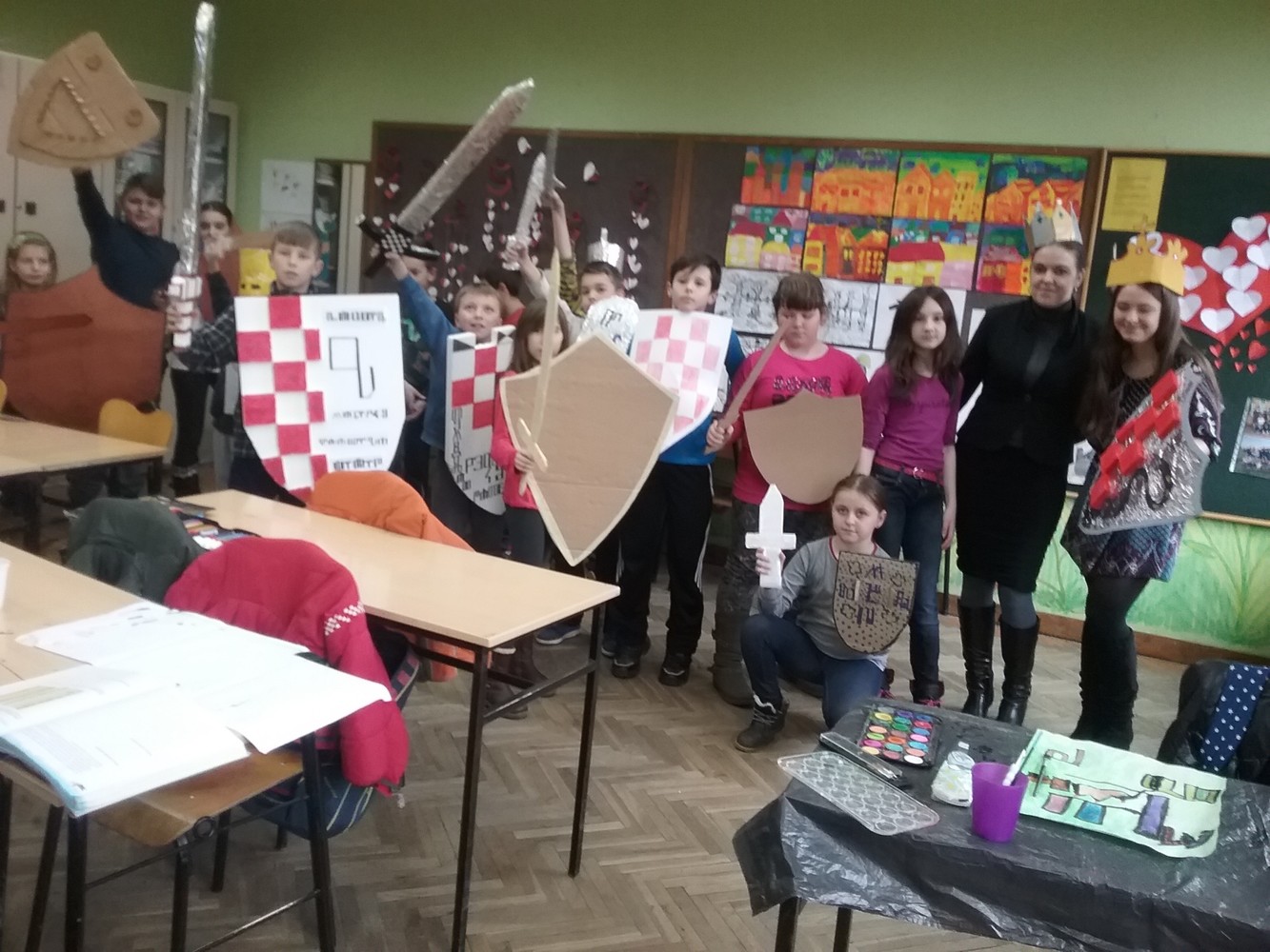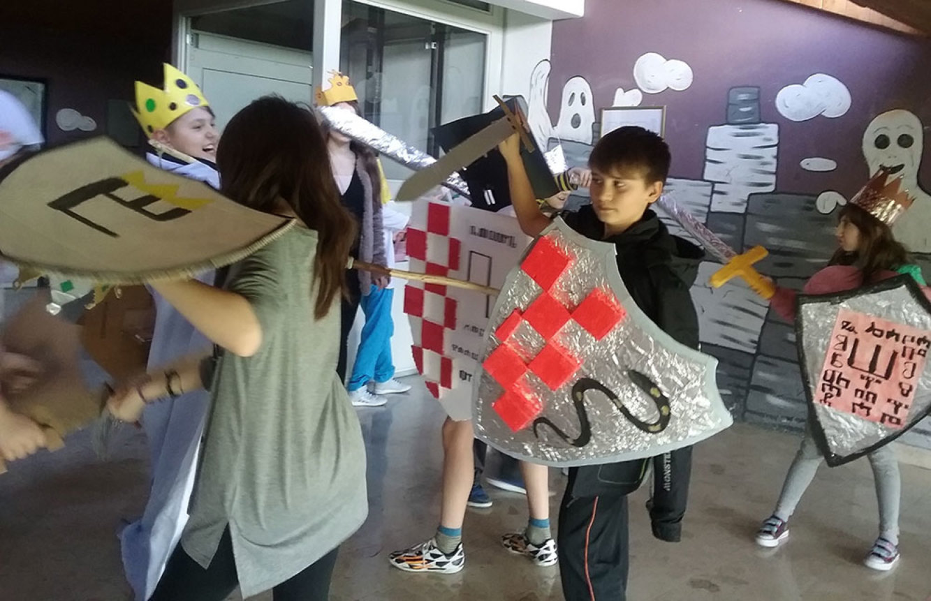 Na likovnom su učenici glagoljicom ispisivali obiteljske grbove kojima su potom uresili svoje štitove. Roditelji učenika pomogli su u izradi sablji, zaštitnih kaciga i kruna.vi, kneginje i kraljevi u zanimljivom dijelu potkrovlja škole okušali su se u svojim borilačkim vještinama i uprizorili „pravo bojno polje“…