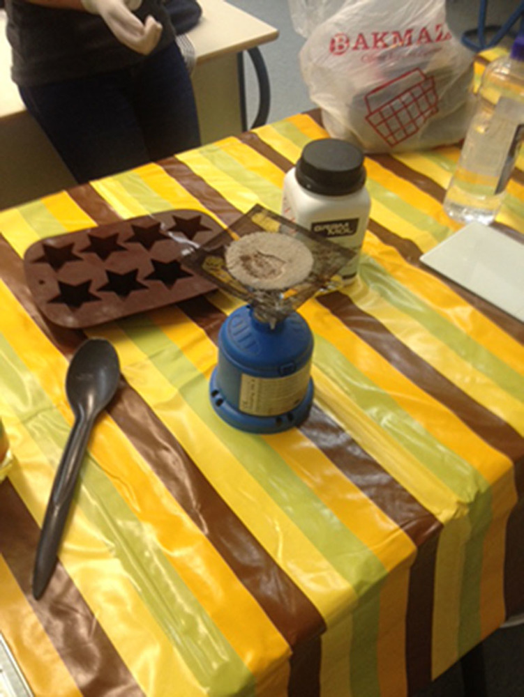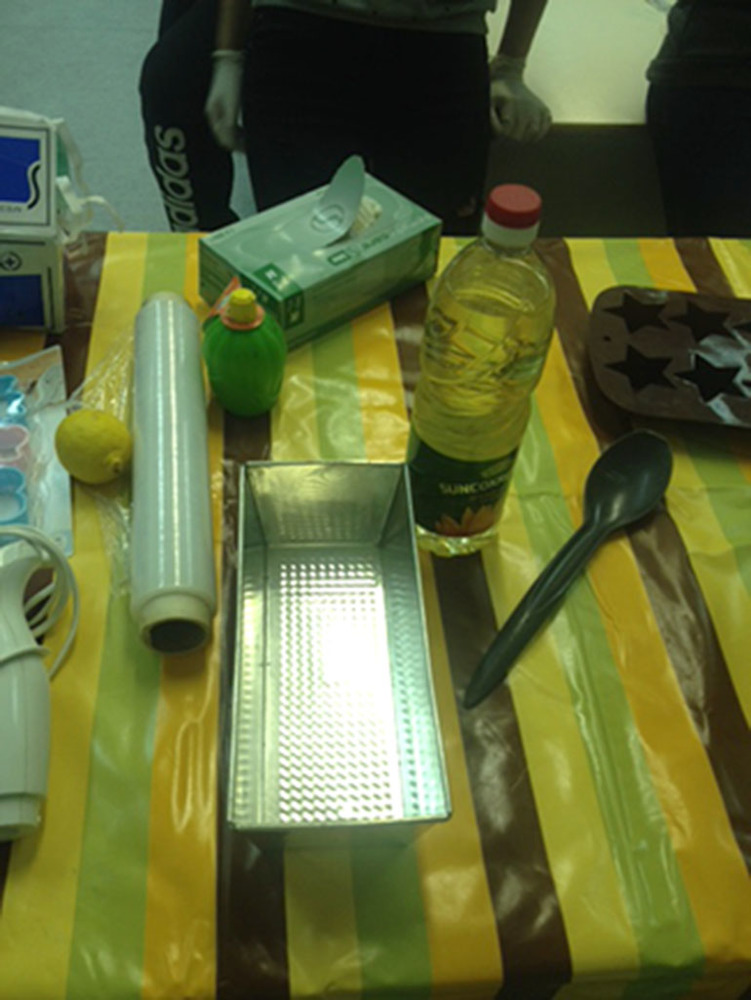 Svi materijali koje učenici koriste su prirodni, a posude i pribor su plastični zbog moguće reakcije natrijeve lužine sa staklom ili metalom.