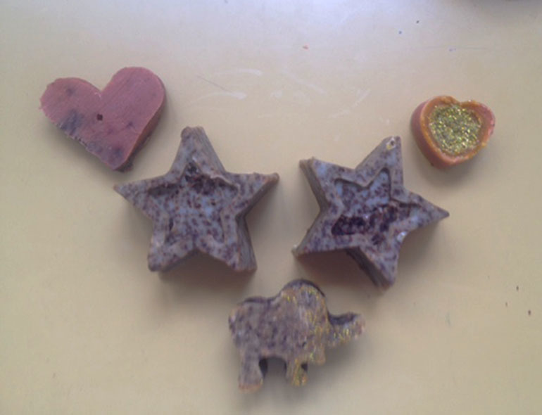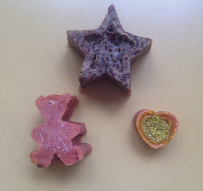 Nakon toga smjesu izlijevaju u plastične ili silikonske kalupe različitih oblika, najčešće srca, zvjezdica ili u velikih duguljastih kalupa iz kojih se sapun može rezati na pločice.