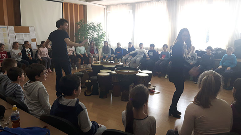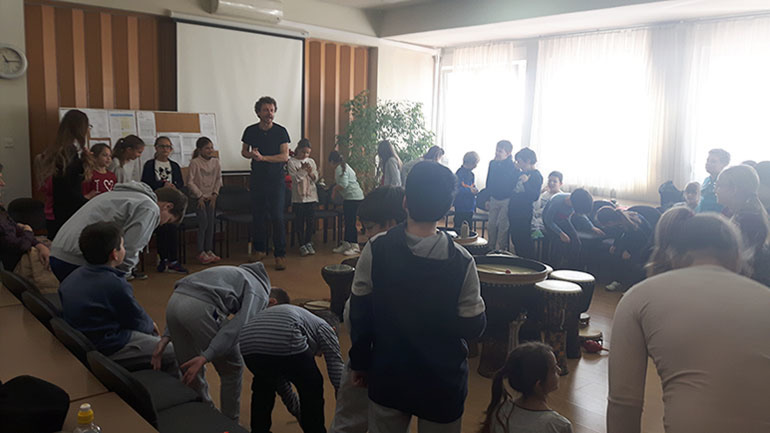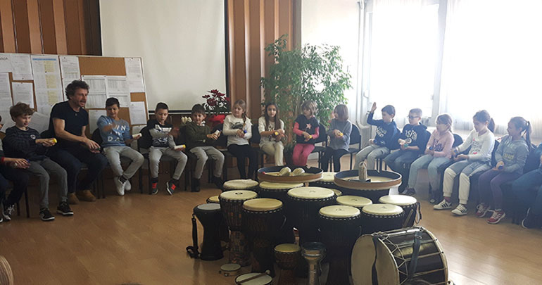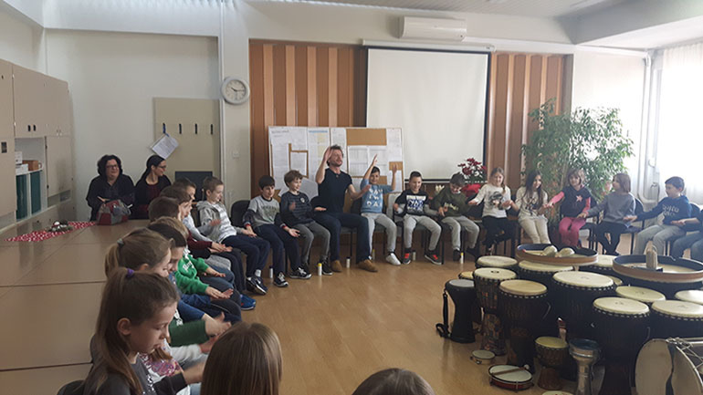 Oduševio nas je pristupom i svojim bubnjanjem. U zbornici škole primio je dvije grupe đaka, sve naše trećaše. Napravili su bubnjarski krug i naučili što je to tjeloglazba, vidjeli neke vrste bubnjeva (darbuka, đemberi, dajre, bendir i tapan), šuškali zvečkom i čuli kako smo za nju od najranijih dana vezani; prvo je što čujemo u majčinoj utrobi otkucavanje njezinog srca i ritam njenog disanja (udah, izdah), što kasnije prepoznajemo u zvečki.