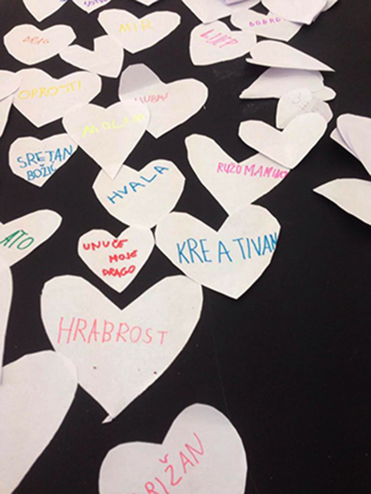 Bilo je vremena i za popunjavanje ručno izrađene križaljke koju je osmislila učiteljica (vrsta riječi – imenice). Zajednička aktivnost na satu razrednika bila je pisanje 100 lijepih riječi na 100 izrezanih srca.
