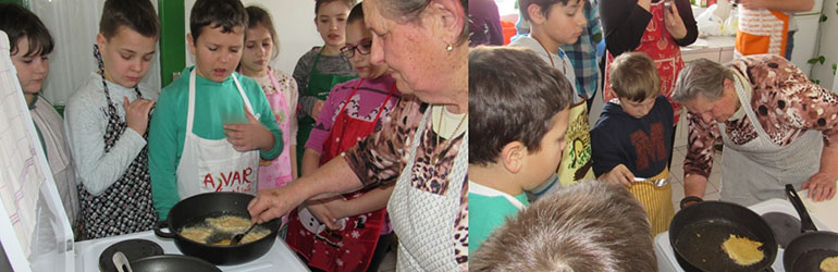 Zlata Kranjčić i Olgica Vidaković prenijele su malim kuharima iz 4.a recepte za taranu na mlijeku i palačinke od krumpira. Potom su svi zajedno uz pomoć razrednice Zorice Novokmet i gerontodomaćica Danijele Bojanić i Tanje Adžijević najprije pripremili taranu na mlijeku, a nakon degustacije i drugi specijalitet – palačinke od krumpira.