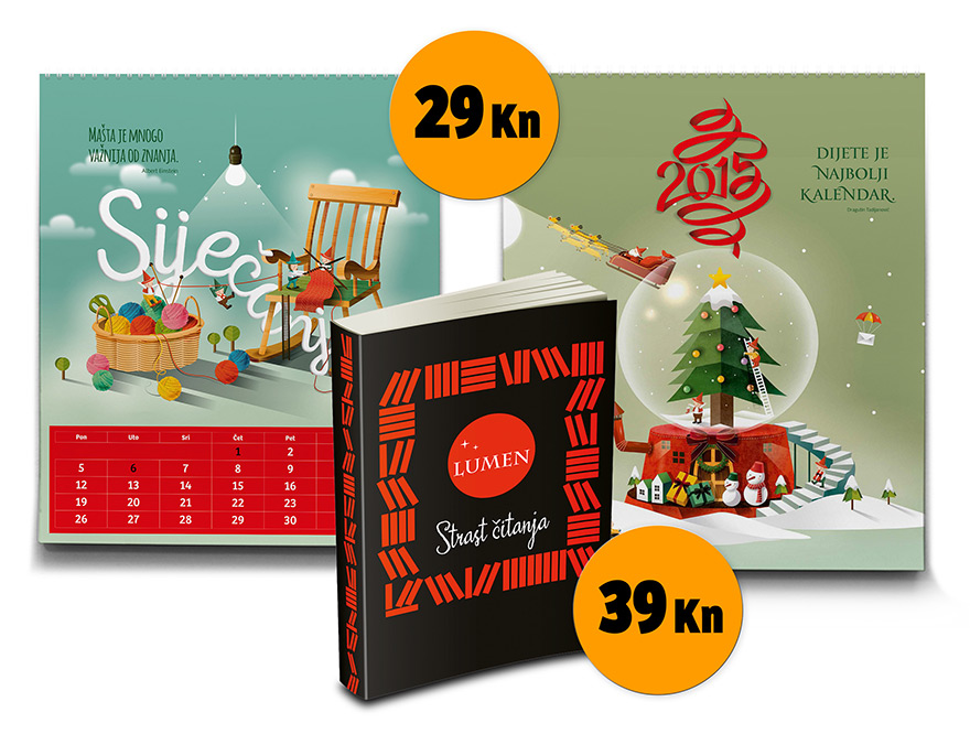 U knjižarama „Školske knjige“ još uvijek se mogu nabaviti predivni kalendari za 2015. kroz koju vas vode mudre misli i izvanredne ilustracije za samo 29 kuna, a ako vas zanima u prodaji su i vrlo zanimljivi „Lumen planeri“ za svega 39 kuna.