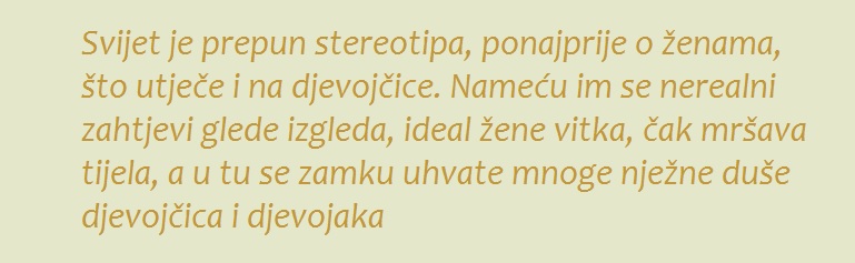 Anoreksija je danas vrlo prisutan problem, no malo se o toj bolesti zna i malo se o njoj govori. Poznajem dvije djevojke koje su si upropastile mladost izgladnjivanjem. I jedna i druga bile su perfekcionistice, odlikašice koje su puno očekivale od sebe, baš kao i moj lik. Dok sam pisala roman, posjećivala sam stranicu na kojoj su djevojke oboljele od anoreksije pisale svoje objave. Njihove su priče pretužne. I prestrašne. Autodestrukcija mlade osobe nešto je što čovjeka dirne pa poželi nekako pomoći onima kojima se još može pomoći.