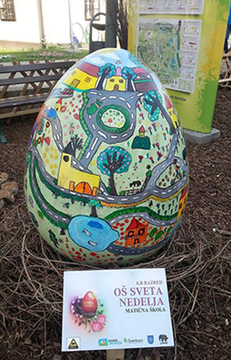 Svi učenici u razredu sudjelovali su u tom pothvatu. Mjesec dana smo izrađivali detalje – jezera koja ima Sveta Nedelja, biciklističke staze, rotore, dvije crkve... Svaki je učenik napravio neku svoju sličicu na jajetu.