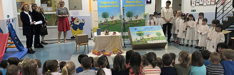 Ravnateljici vrtića Zvončić Vesni Novosel tradicijske drvene igračke proizvedene u Mariji Bistrici zajedno su uručile Gordana Lipšinić, gradonačelnica Ozlja, i Mirjana Drobina, autorica projekta Dajmo djeci korijene i krila. Dječji vrtić Zvončić 80. je širom Hrvatske u koji je stigao projekt Dajmo djeci korijene i krila. Na inicijativu gradonačelnice Gordane Lipšinić, realizaciju projekta u Ozlju omogućili su Grad Ozalj i Karlovačka županija. Ozaljski mališani pokazali su oduševljenje poklonom i zanimljivom predstavom, a zahvalili su i prigodnim programom.