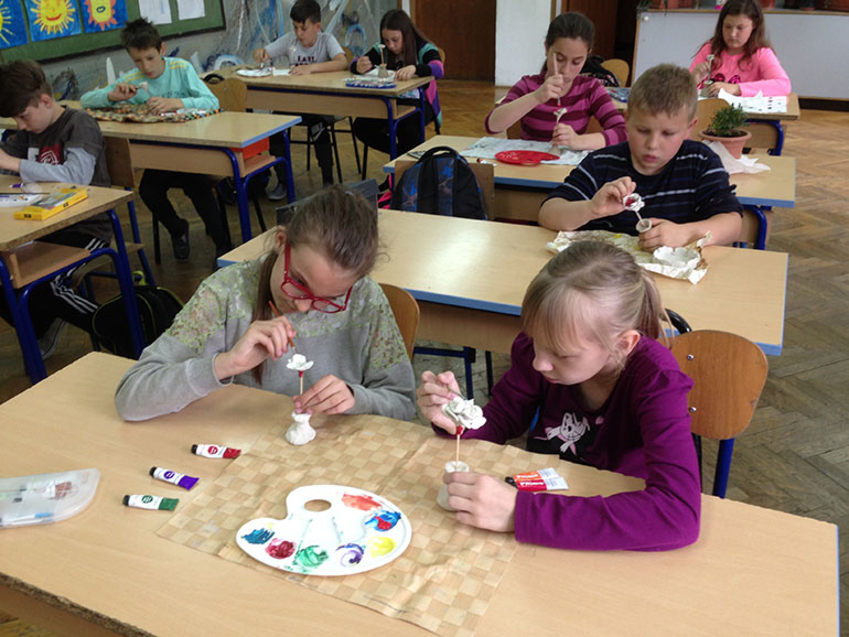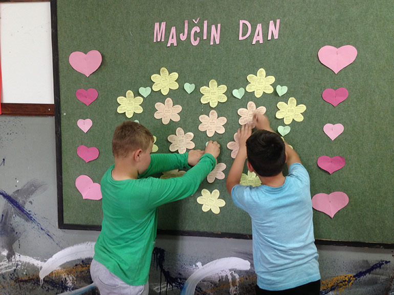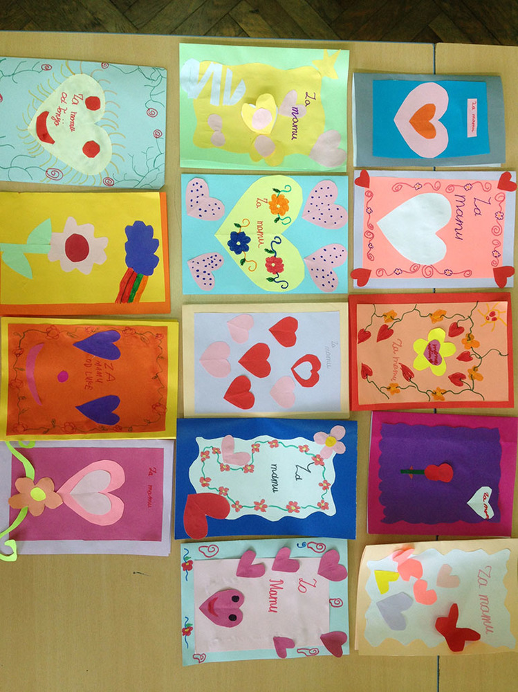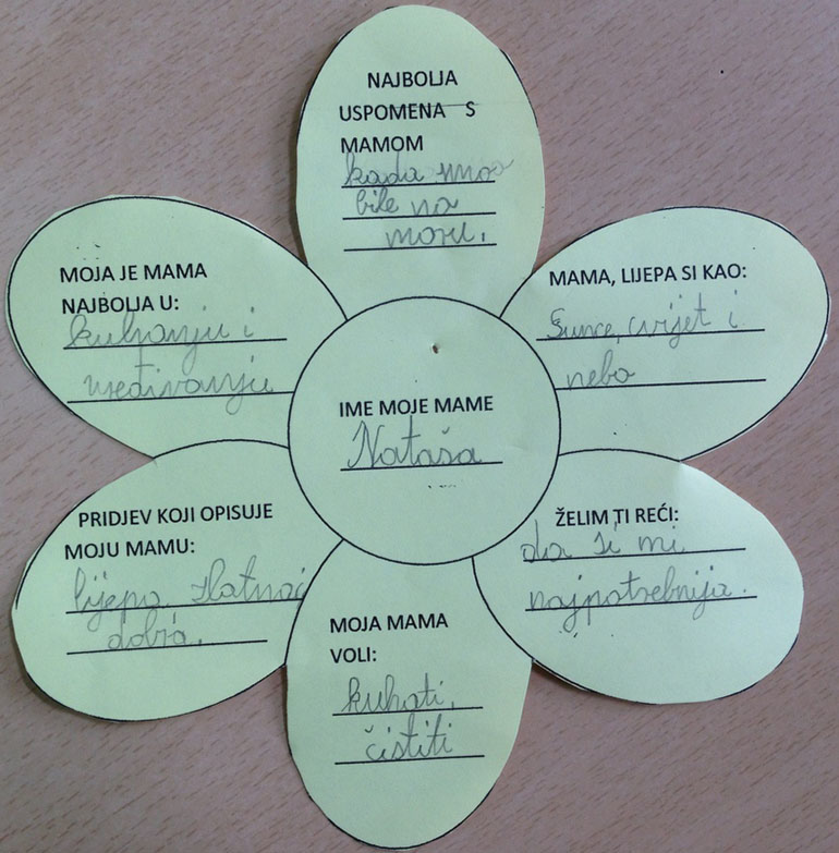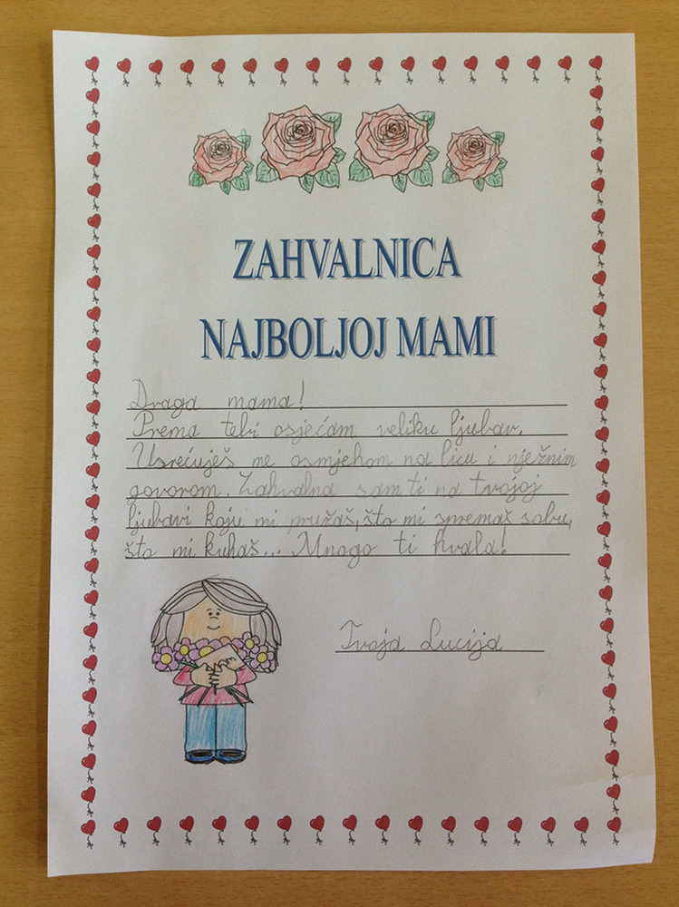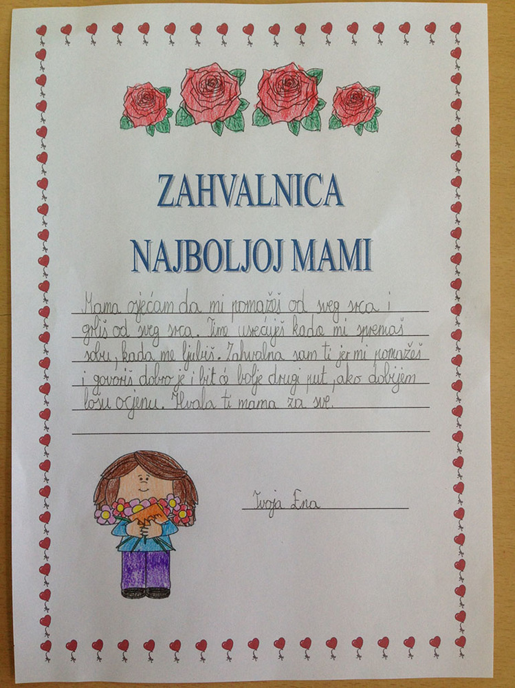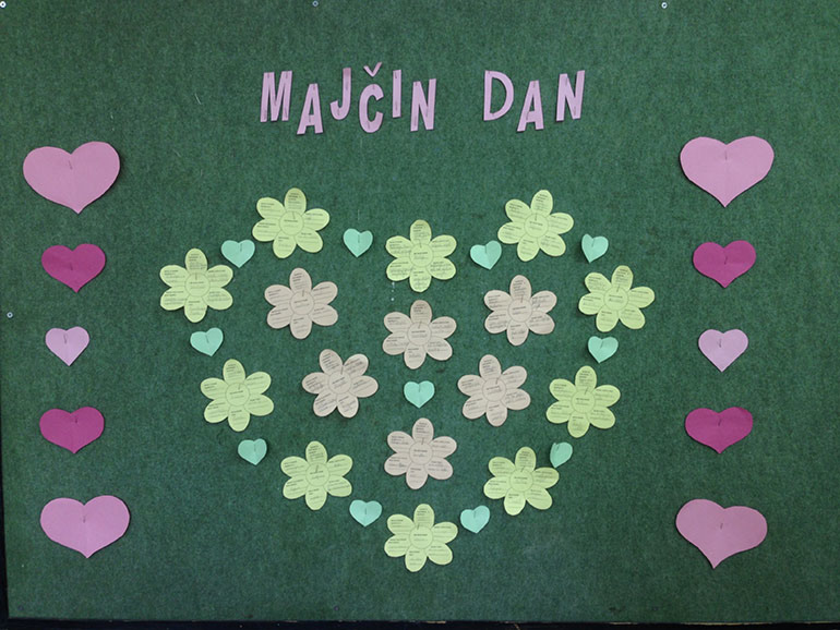 Svi su zajedno modelirali ružu od glinamola i onda je bojali temperama. Pisali su zahvalnice i čestitke i tako su svoje osjećaje prenijeli na papir. Uređen je i razredni pano kako bismo pokazali koliko nam je majka važna osoba u životu.