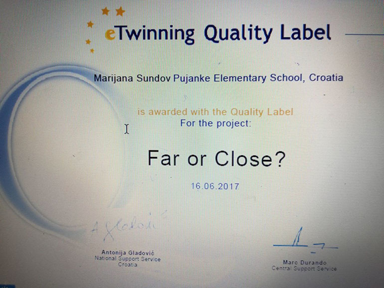 eTwinning projekt 'Far or Close?' nastao je kao rezultat kontaktnog eTwinning seminara u Krakowu (Poljska) na kojem je učiteljica Marijana ŠUDNOV upoznala dvije kolegice iz Poljske, kolegu iz Cipra te kolegicu iz Turske.
