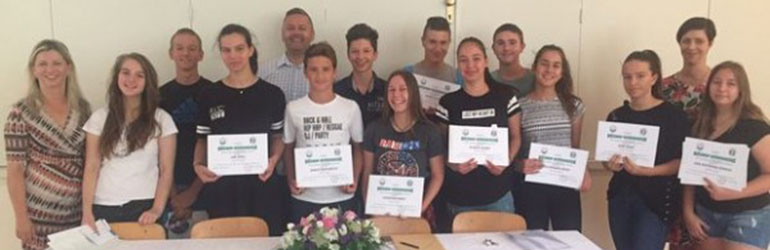 ... na dosadašnjem uspjehu i poželjela sreću pri upisu željene srednje škole. Istaknuti su učenici koji su prošli sve razrede s odličnim uspjehom, uzornog vladanja te koji su sudjelovali na najmanje jednom natjecanju županijske razine. Tako je nagrađeno 12 učenika priznanjem Učenik generacije, a učenik 8.c Luka OKMAŽIĆ proglašen je Ponosom generacije. Ravnateljica je učenicima dodijelila priznanja, dok je Ponos generacije za poklon dobio ručni sat.