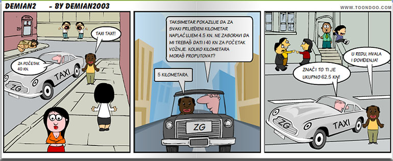 Učenik Demian dosjetio se zanimljive ideje o iznajmljivanju taksija na godišnjem odmoru stripom: http://www.toondoo.com/ViewBook.toon?bookid=664131
