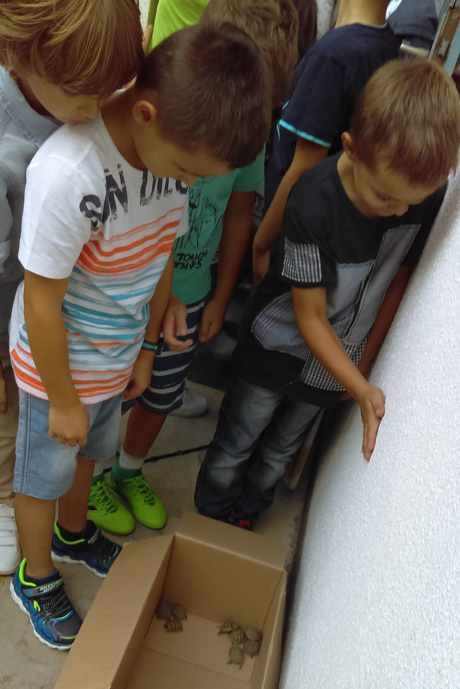 Velike kornjače ostale su u našem vrtu, a bebe kornjače preselili smo na toplo, u jedan sunčani razred i za njih čekamo terarij. Dok su još malene, trebaju boraviti na toplome i svijetlome mjestu da bi im se povećala šansa za preživljavanje. U prirodi ih ne preživljava mnogo u prvoj godini života pa su zbog toga, među ostalim, i zaštićene životinje.