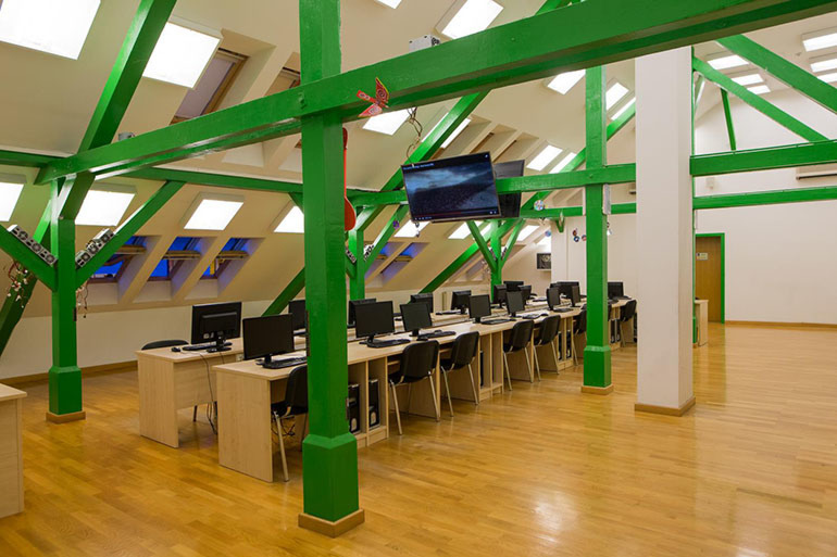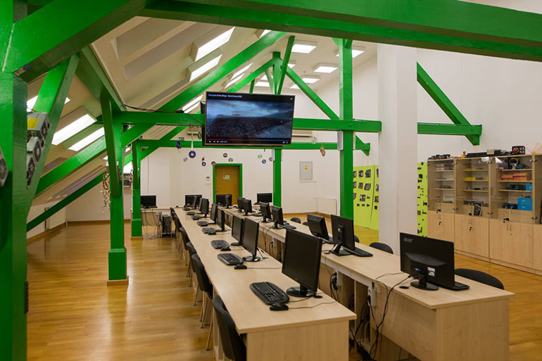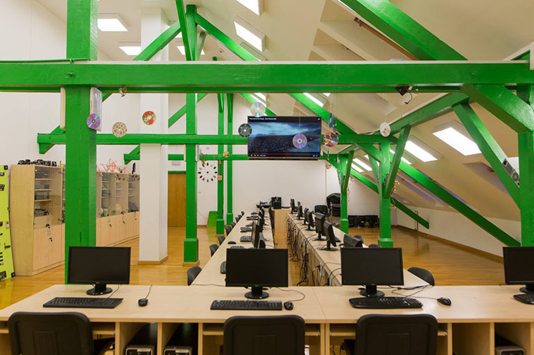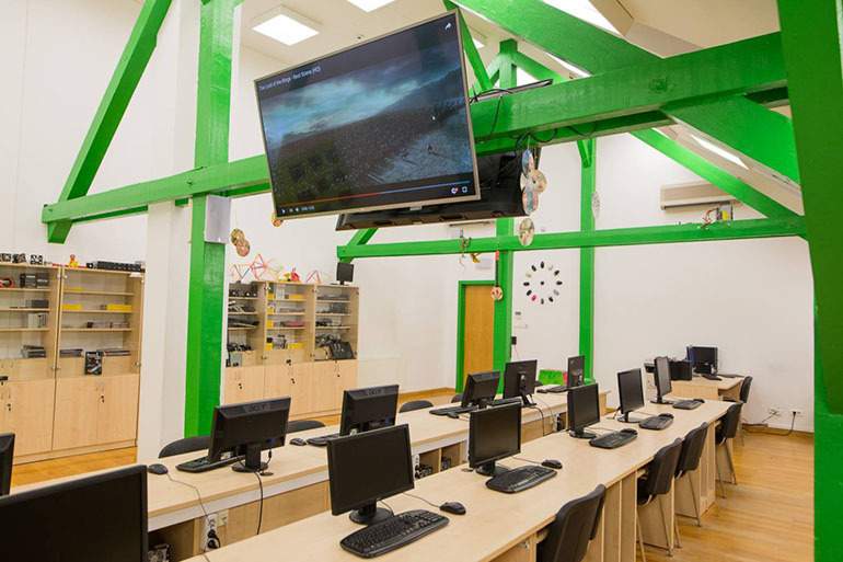 Na centralnim gredama su dva TV-a dijagonale 152 centimetra svaki, okrenuti prema suprotnim stranama učionice. Strujni i HDMI kabeli provučeni su kroz vodilice do računala (provlačili učenici!).