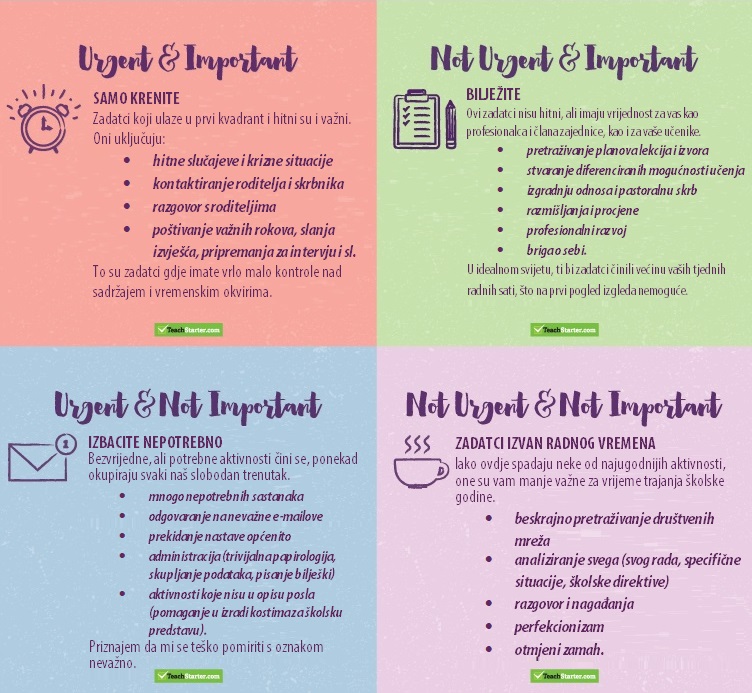 Pobrinite se da rezervirate vrijeme za zadatke iz ovoga kvadranta. To je od ključne važnosti i pomoći će vam da se usredotočite na posao koji ima pravi i značajan utjecaj na vas, vaše učenike i školsku zajednicu. Osim toga, ovakav posao pruža osjećaj osobnog i profesionalnog postignuća.