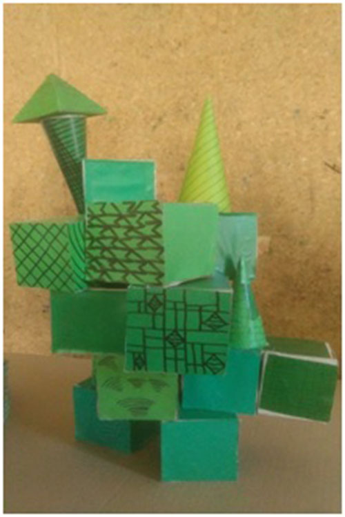 Radovi mojih učenika na temu grad budućnosti, igra geometrijskim tijelima.