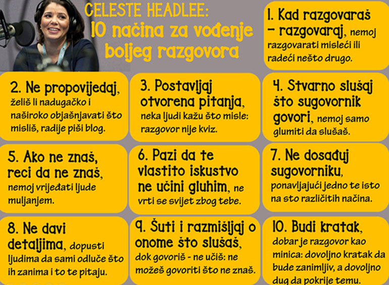 Tajna uspješnoga razgovaranja zapravo je jednostavna. Celeste Headlee, radijska voditeljica koja je godinama iznimno uspješno intervjuirala tisuće ljudi najrazličitijih profila, sažela je svoja iskustva o uspješnom vođenju razgovora u sjajnom TED govoru snimljenom 2015. godine.