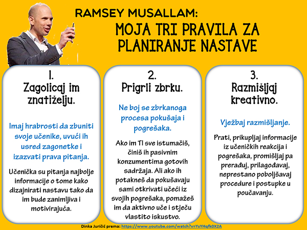 Na to je pitanje vrlo zgodno svojim TED govorom odgovorio Ramsey Musallam, učitelj kemije. Ispričao je kako se nakon deset godina predavanja kemije u školi odjednom našao u situaciji da mora na operaciju na otvorenome srcu... i da ga je mudrost njegova kirurga zapravo navela da posve promijeni način na koji je dotad radio u razredu. Shvatio je, naime, da pravo poučavanje ne počinje nastavnim planom, nego učeničkim pitanjima. Svakako pogledajte tih šest inspirativnih minuta njegova govora.
