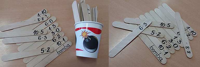 Za početak igre dovoljno nam je znati množiti s tri broja, ali što je više naučenih brojeva, to je više zadataka pa je i igra zabavnija. Na jedan (ili dva) štapića sam napisala „bomba“ i stavila ih u čašu zajedno sa zadatcima za množenje.