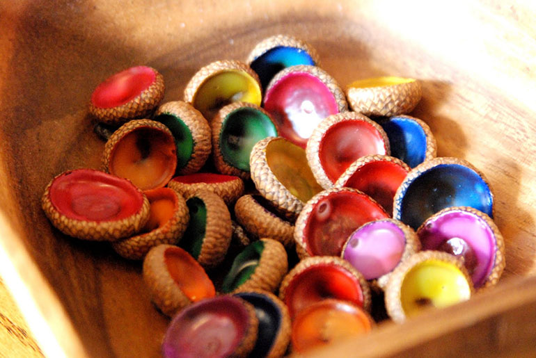 Za početak je potrebno prikupiti dovoljno kapica. Učenici potom mogu bojiti unutrašnjost kapica flomasterima ili temperama. Kad sve kapice oboje iznutra, u svaku bi kapicu trebalo uliti ljepilo za drvo, i to u tolikoj količini da prekrije obojeno područje debljine barem jedan milimetar. Rado upotrebljavam ljepilo za drvo jer ono, kad se osuši, postane prozirno pa se kapice žira doimaju kao da su lakirane.