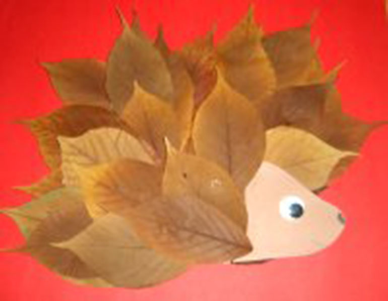 Nakon nekoliko dana prešanja učenici donose listove. Iz tvrđega bijelog papira izrezat ćemo oblik ježeve glave. Potrebno je imati oči, njušku i usta. Na ostatak papira lijepimo listove (može i običnim ljepilom za papir iako ja najradije upotrebljavam ljepilo za drvo). Lijepimo jedan po jedan i tako formiramo tijelo ježa. Tako zalijepljeno lišće nastavit će se sušiti pa će se vrhovi početi uvijati poput pravih ježevih bodlja.