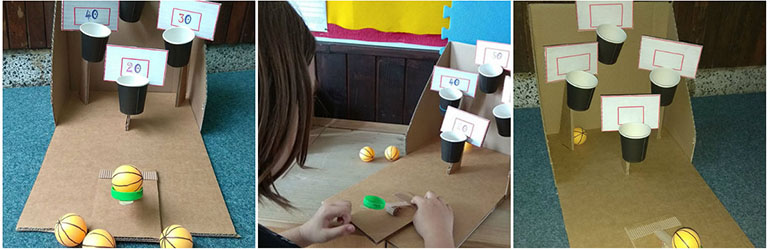 „Katapult” odnosno igrača koji ubacuje loptu u koš izradila sam na vrlo jednostavan način. Jedan dio drvenog štapića ugurala sam u karton te učvrstila vrućim ljepilom. Preko toga sam nalijepila trakicu valovite ljepenke iz estetskih razloga.