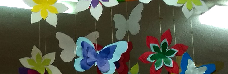 Dok sam ja pripremala mobil, učenici su iz kolaža izrezivali šarene leptire i cvjetove koje smo potom zajedno pričvrstili ljepljivom trakom za strune.